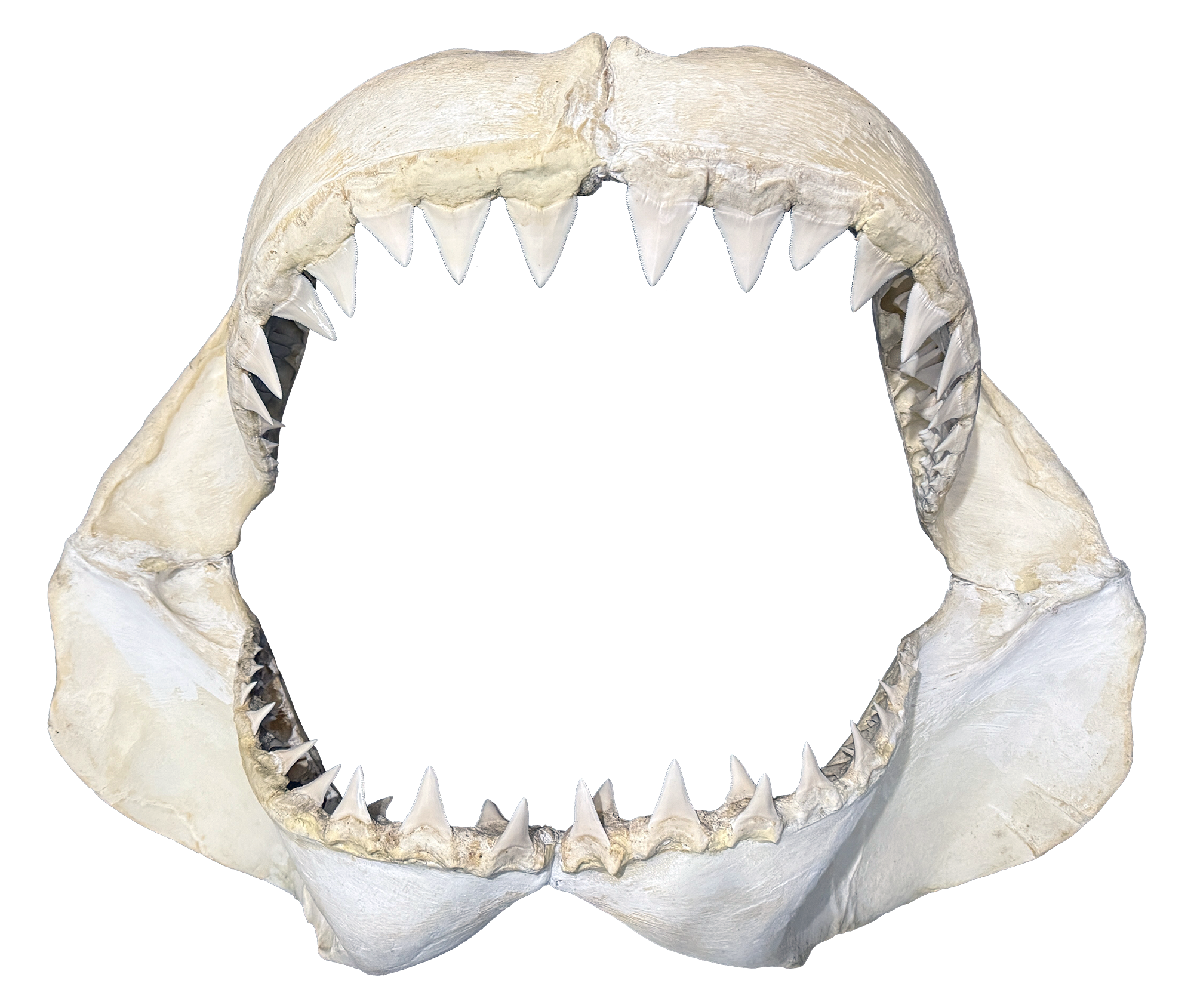 This jaw comes from a great white shark caught by a local fisherman off La Réunion in 1994. The shark measured about 5.58 meters in length, making it an exceptionally large specimen.